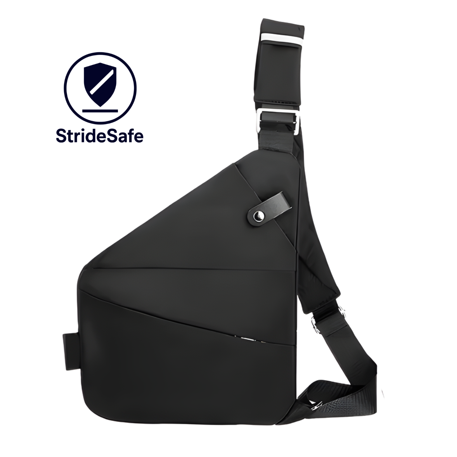 StrideSafe – Sicherheit durch schnittfestes Material. Die Tasche besteht aus schnittfestem Gewebe und verstärkten, schnittfesten Riemen. Verdeckte Reißverschlüsse und das unauffällige Design schützen deine Wertsachen unterwegs.